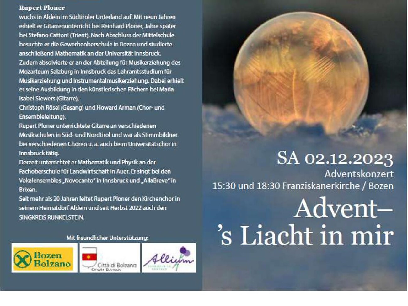 Il Singkreis Runkelstein e il Latzfonser Stubnmusig, sotto la direzione generale di Rupert Ploner, creano un'atmosfera prenatalizia con meravigliose canzoni popolari alpine e suoni strumentali finemente suonati. Soprattutto durante l'Avvento, la gente ama la musica tradizionale alpina in tutte le sue forme. Ma anche musica contemporanea, come "O nata lux" di Morten Lauridsen del 1997.