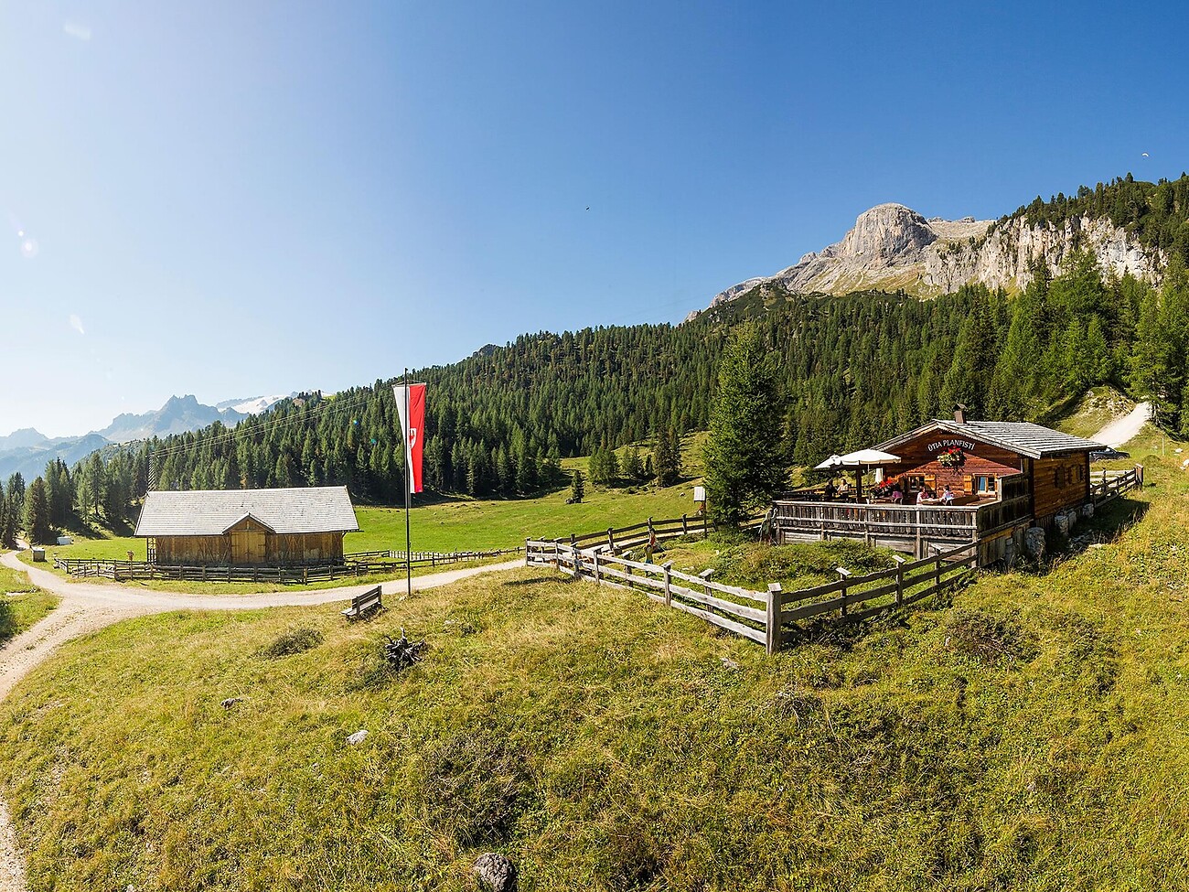 Con una facile passeggiata raggiungerai la malga di montagna Planfistí dove il tempo pare si sia fermato. In questa bellissima architettura rurale puoi assistere alla preparazione del burro ad opera della proprietaria Maria e ad altri lavori che abitualmente si svolgono in quota. La vita di montagna a contatto con la natura vista da vicino. Pura emozione.