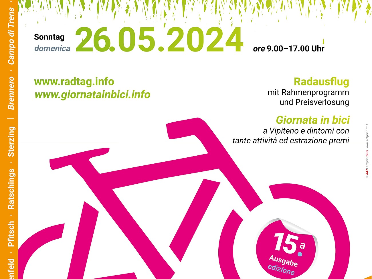 Questa manifestazione è un ottima possibilità per lasciare a casa l'automobile e per passare con la famiglia, gli amici ed altri appassionati una giornata sul dueruote. Tante associazioni tra Campo di Trens, Prati, Vipiteno, Mareta, Colle Isarco e il Brennero presenteranno un programma variopinto di animazione, ristoro e divertimento attorno alla bicicletta.