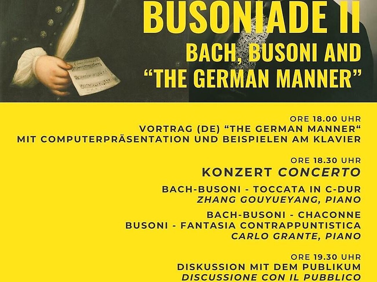 Busoniade II: Conferenza "The German Manner" in lingua tedesca, concerto Bach-Busoni con i pianisti Zhang Gouyueyang e Carlo Grante, discussione con il pubblico.