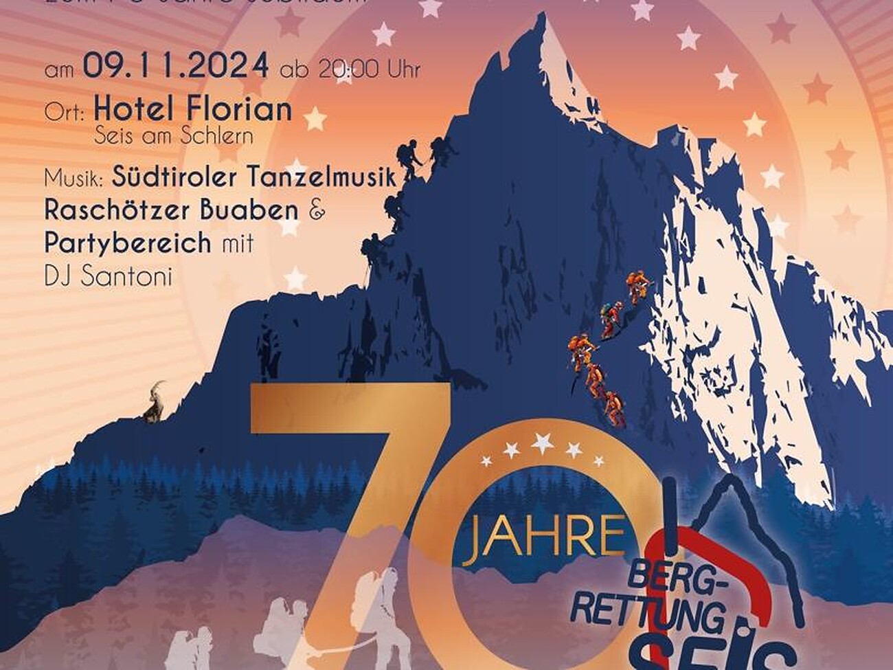 Il soccorso alpino di Siusi allo Sciliar è stato fondato 70 anni fa. Questo è un motivo per festeggiare. Tutti gli amici e sostenitori del soccorso alpino sono cordialmente invitati al ballo presso l'Hotel Florian.