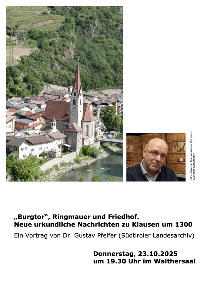 Neben dem reinen Rechtsakt können sie auch Sachverhalte festhalten, die darüberhinausgehend für die Geschichte bedeutsam sind. Eine bislang kaum beachtete Urkunde von 1304 soll im Mittelpunkt des Vortrags stehen. Sie enthält die (bislang) ältesten Erwähnungen der die Klausner Kernstadt umfriedenden Ringmauer und des Friedhofs bei der Andreaskirche, ferner die ersten schriftlichen Nennungen von Mühlen und einer Badestube in der südlichen Vorstadt. Schließlich bietet sie auch noch den ältesten bekannten Schriftbeleg für das ältere Brixner Tor („Burgtor“).
