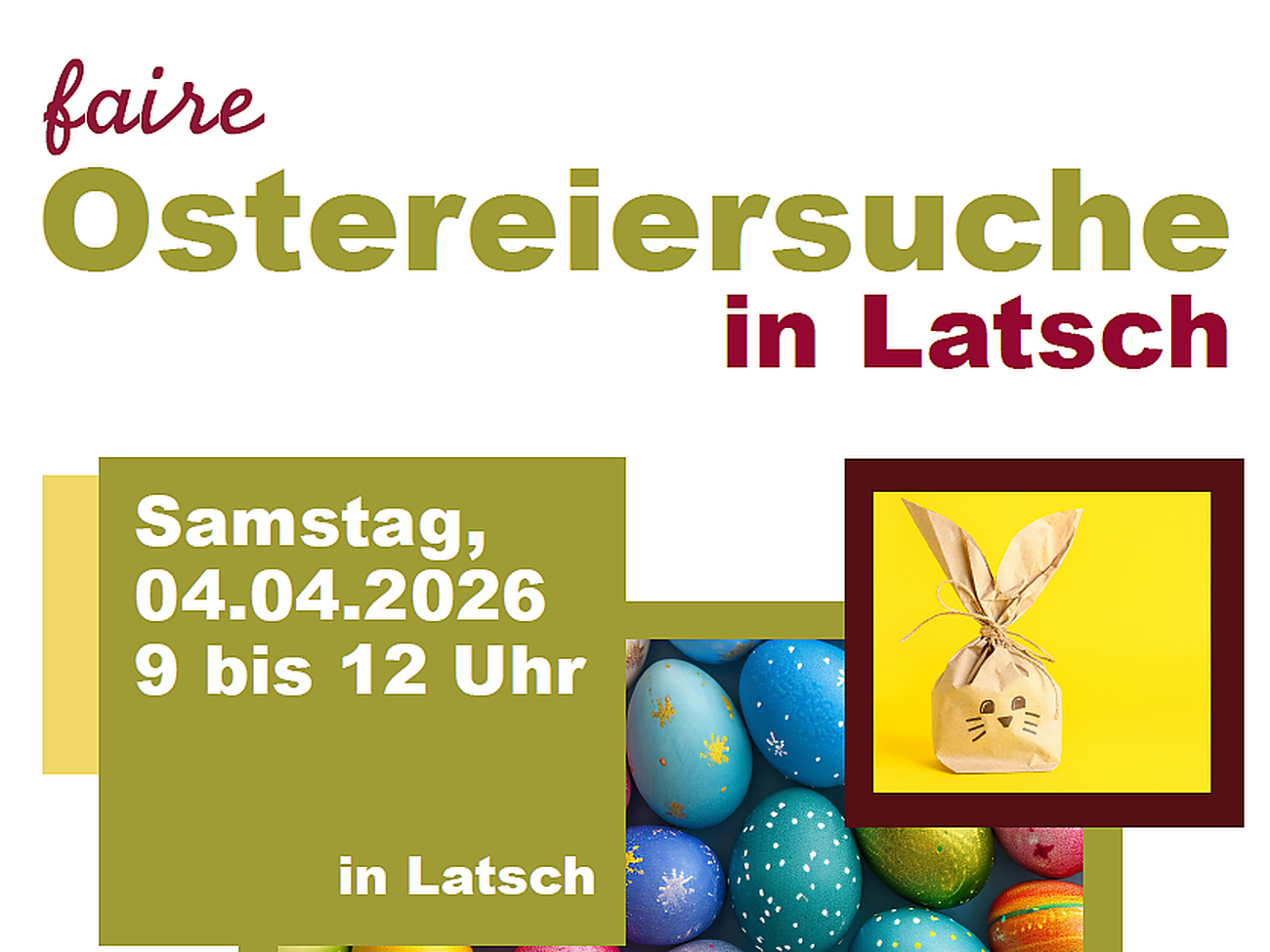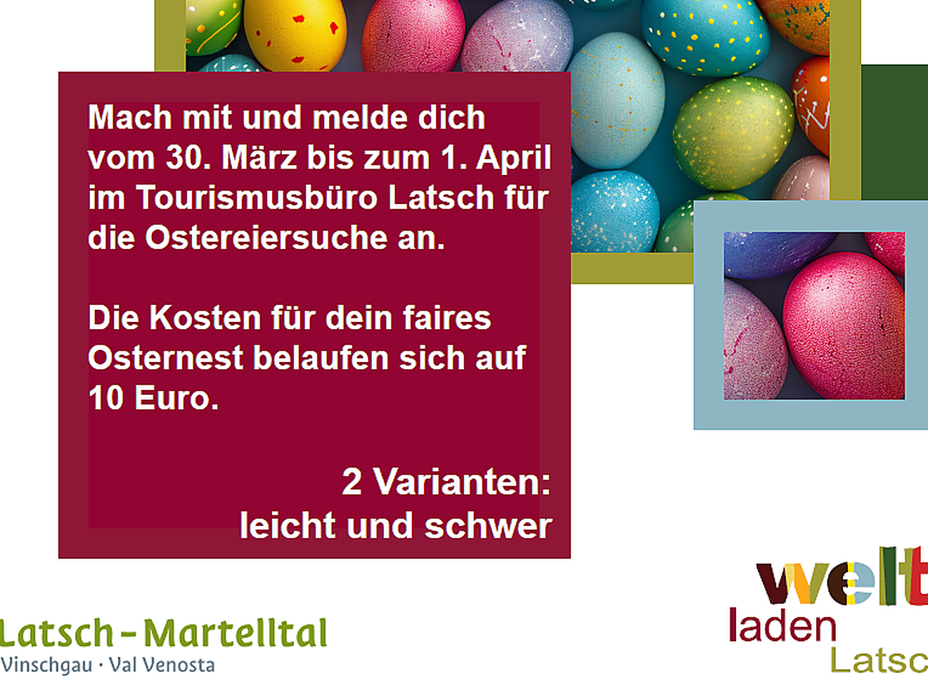 Residenti e ospiti sono cordialmente invitati alla caccia al tesoro pasquale nel paese. Cercando le uova di Pasqua potranno scoprire la parola chiave o risolvere indovinelli e ricevere così il loro cestino pasquale all'ufficio turistico.