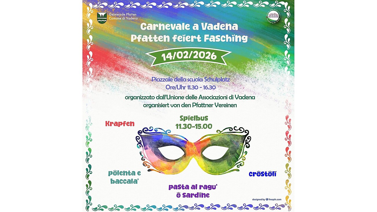 Sabato 14 febbraio 2026, il Comune di Vadena vi invita alla festa di Carnevale presso il Piazzale della Scuola, dalle ore 11.30 alle 16.30.
