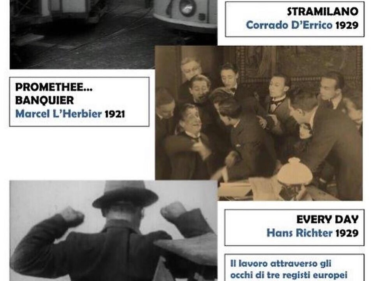 Tre corti di tre registi europei diversi e cinque musicisti che suoneranno per voi in sincronia con le immagini: Stefano Eccher alla tromba, Michele Nascente al trombone, Lorenzo Sighel al sax alto, Michele Kettmaier al pianoforte e Claudio Lombardi al basso. Solo musica originale, arrangiata e scritta per questi tre film legati dal tema del lavoro: “Stramilano” di Corrado D’Errico, “Prometee… banquier” di Marcel L’Herbier e “Every day” di Hans Richter… non mi resta che augurarvi buona visione e buon ascolto! Per chi si è perso la prima a Trento, ecco come recuperare: il cine concerto Radio Days movie “Al lavoro!” verrà replicato presso il Cineforum Bolzano (via Roen, 6) venerdì 30 gennaio ed al cinema Moretto di Brescia (via Moretto, 71) martedì 3 febbraio. Entrambe le proiezioni inizieranno alle 20.30. Videodrome Cineforum Bolzano