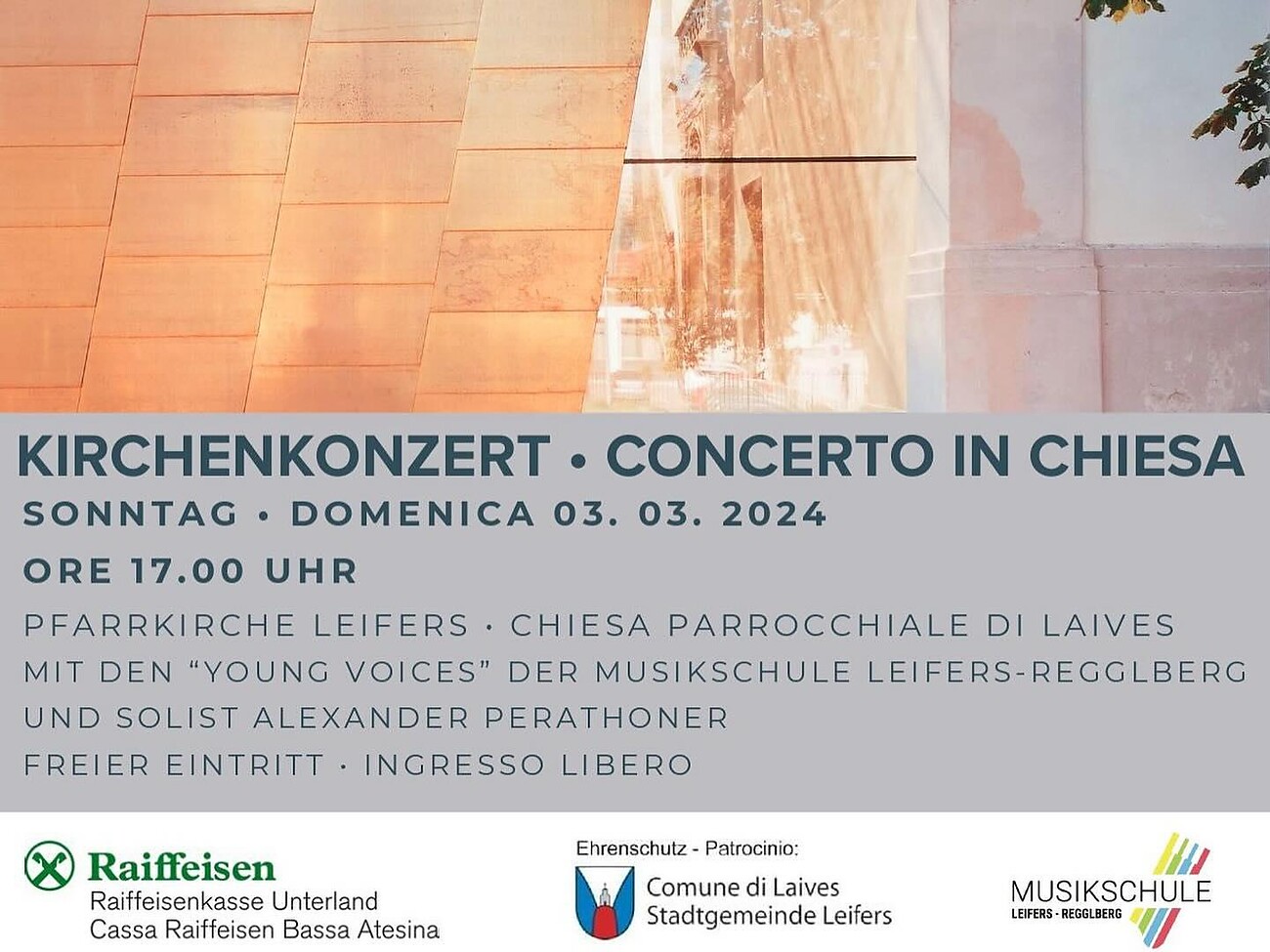 La banda musicale di Laives invita al concerto di domenica 03 marzo 2024 alle ore 17.00 nella chiesa parrocchiale di Laives con i "Young Voices" della scuola di musica Laives-Regglberg e il solista Alexander Perathoner.