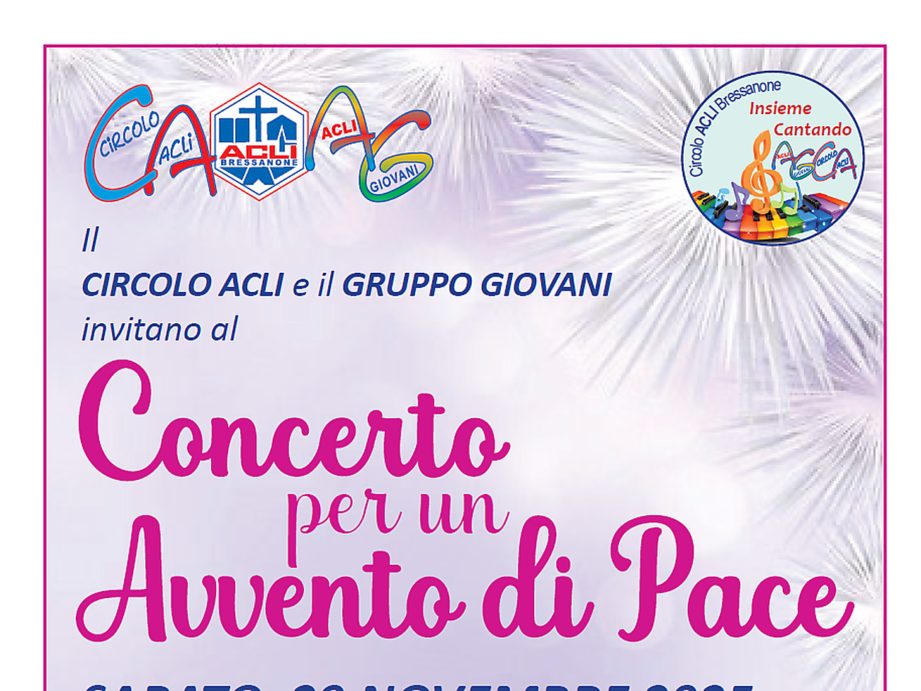 Il Circolo ACLI e il Gruppo Giovani di Bressanone invitano al concerto “Avvento di Pace”, un momento musicale e riflessivo per entrare nello spirito dell’Avvento. Il programma prevede canti del gruppo “Insieme Cantando”, melodie all’arpa eseguite da Sonia Ortlinghaus, letture sulla pace e saluti istituzionali. L'ingresso è libero e aperto a tutti, per condividere un’atmosfera di raccoglimento e armonia prenatalizia.
