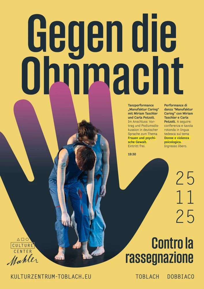 La serata sarà aperta dalla performance di danza “Manufaktur Caring” delle ballerine Miriam Taschler e Carla Petzolt, che affronta il tema dell'essere donna in un sistema patriarcale. A seguire, una conferenza introduttiva e una tavola rotonda sul tema “Donne e violenza psicologica” sensibilizzeranno il pubblico sulle forme spesso invisibili di violenza, come la manipolazione psicologica e il ricatto emotivo.