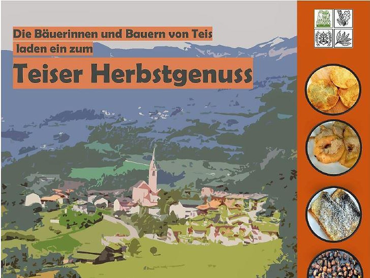 I contadini di Tiso vi invitano a partecipare alle "Delizie autunnali a Tiso" domenica 17 ottobre alla piazza delle feste. Dalle ore 10.00 alle 14.00 saranno offerte varie specialità culinarie da ritirare. Possibilità di picnic disponibile!