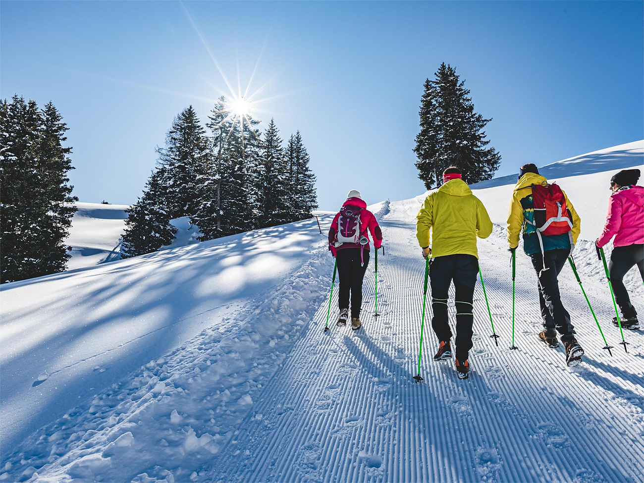 Accompagnati da una guida escursionistica, si parte dal Monte Pana in autobus. Dopo ci si incammina nel magico e silenzioso mondo della montagna invernale dell’Alpe di Siusi. Dopo pranzo al rifugio Moglinon, si può scegliere se scendere al Saltria a piedi o in slittino. Da lì, si rientra al punto di partenza in autobus.