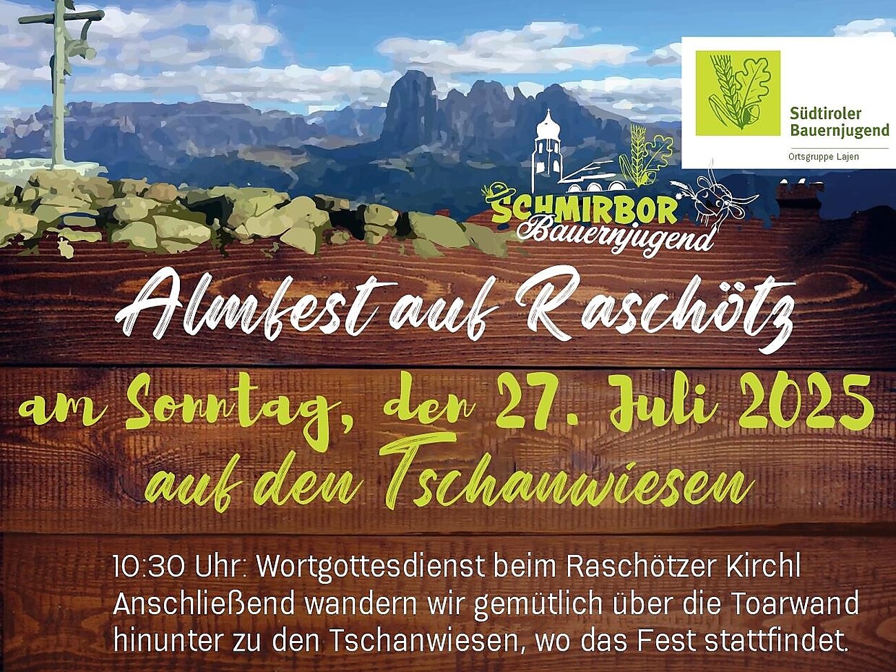Come ogni anno, si terrà di la festa dell'Unione giovani agricoltori di Laion sull' alpe Rasciesa. Alle ore 10:30 inizierà una Santa Messa presso la chiesetta di Rasciesa. Successivamente si camminerà insieme fino ai prati di "Tschan", dove si terrà una piccola festa con accompagnamento musicale.