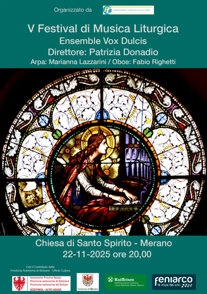 Organizzatore: Federazione Cori dell'Alto AdigeUn viaggio sonoro attraverso i secoli e le tradizioni della musica sacra e spirituale: dalle raffinate polifonie rinascimentali di Palestrina alle intime preghiere contemporanee di Tavener e Porterfield, passando per le suggestioni celtiche e le rielaborazioni moderne di Rutter e Raney.