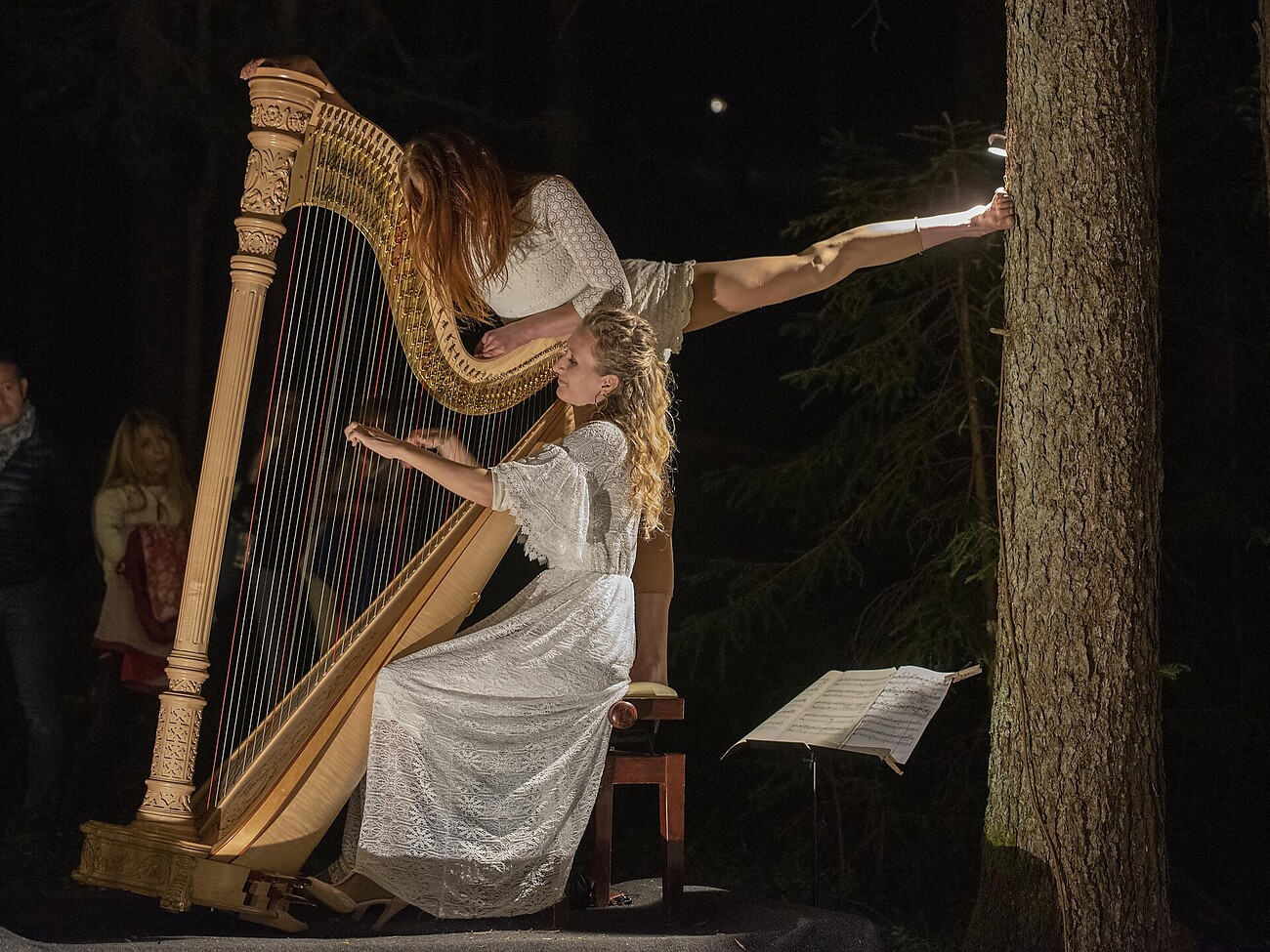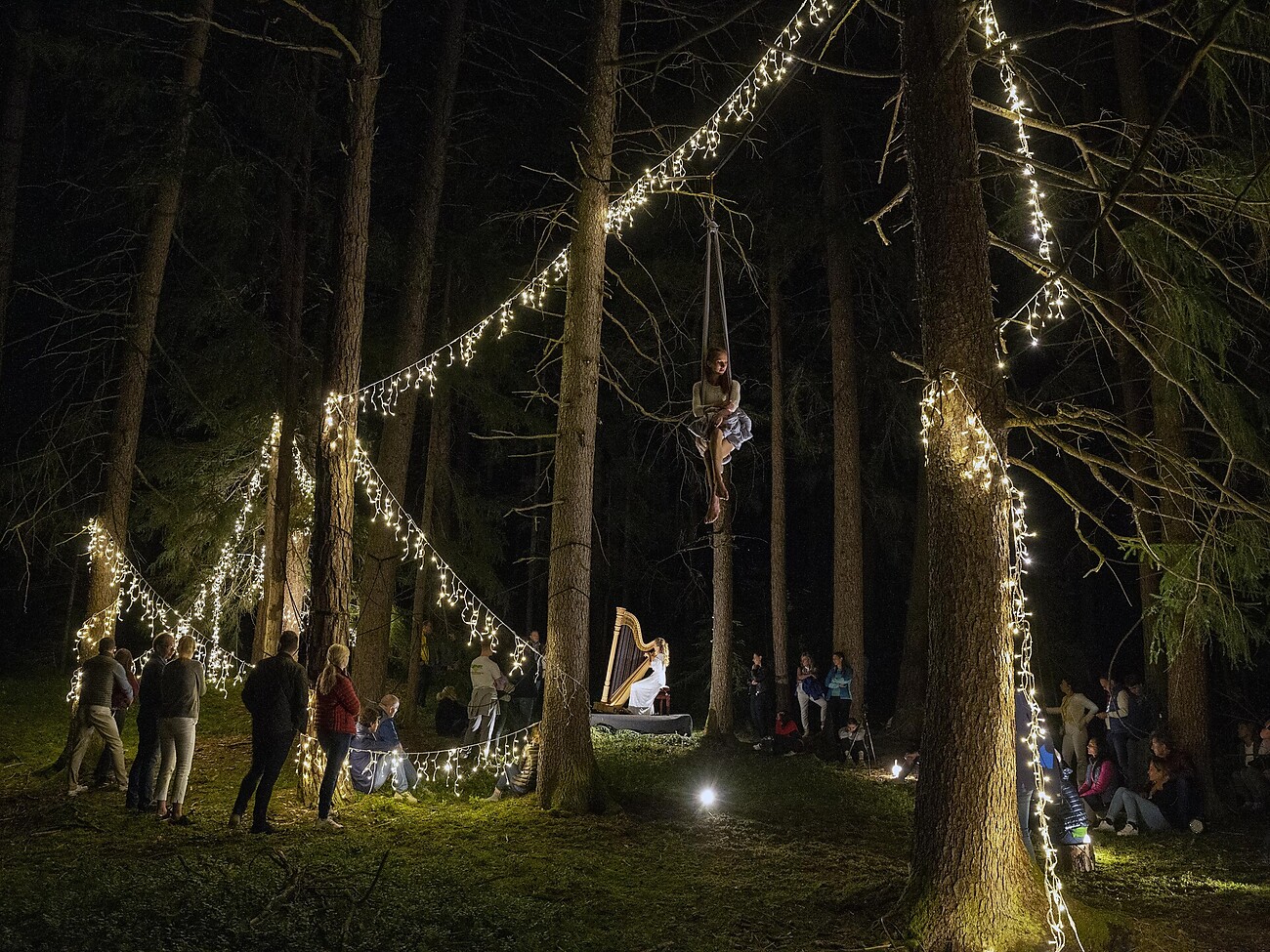 I suoni dell’arpa e l’acrobatica aerea trasformano il bosco in un palcoscenico. Dopo una breve passeggiata insieme si apre una scena in cui musica e movimento si fondono con la natura. Le delicate note dell’arpa e le eleganti figure dell’acrobatica trasformano la radura del bosco in uno spettacolo poetico.