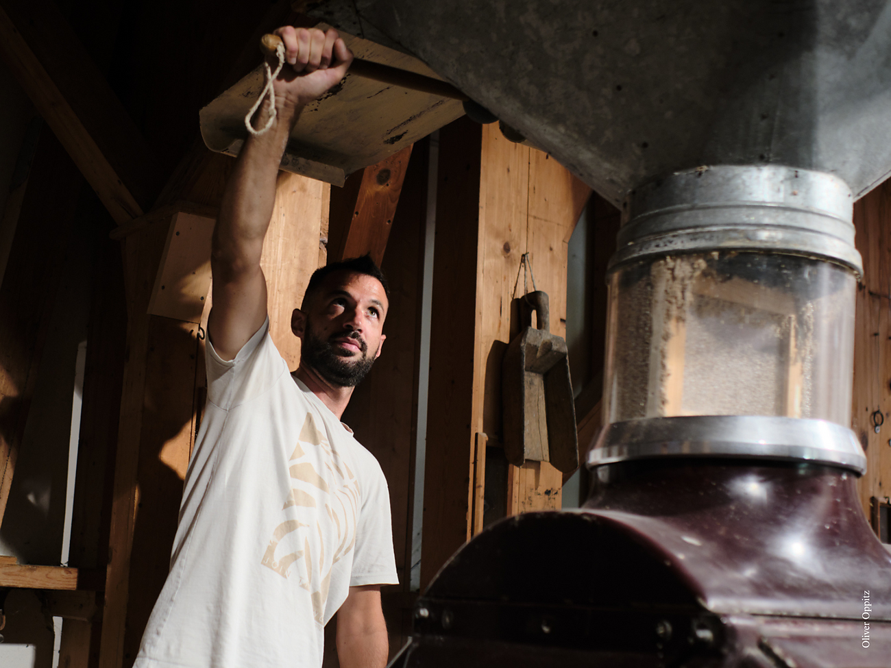 Nei giorni di macina il grano viene macinato nel mulino elevatore ristrutturato del Centro visite Monte Corno. Il mugnaio Valentin Pernter mostra come si produceva la farina in passato e spiega l'affascinante funzionamento del mulino elevatore che si estende su tre piani.