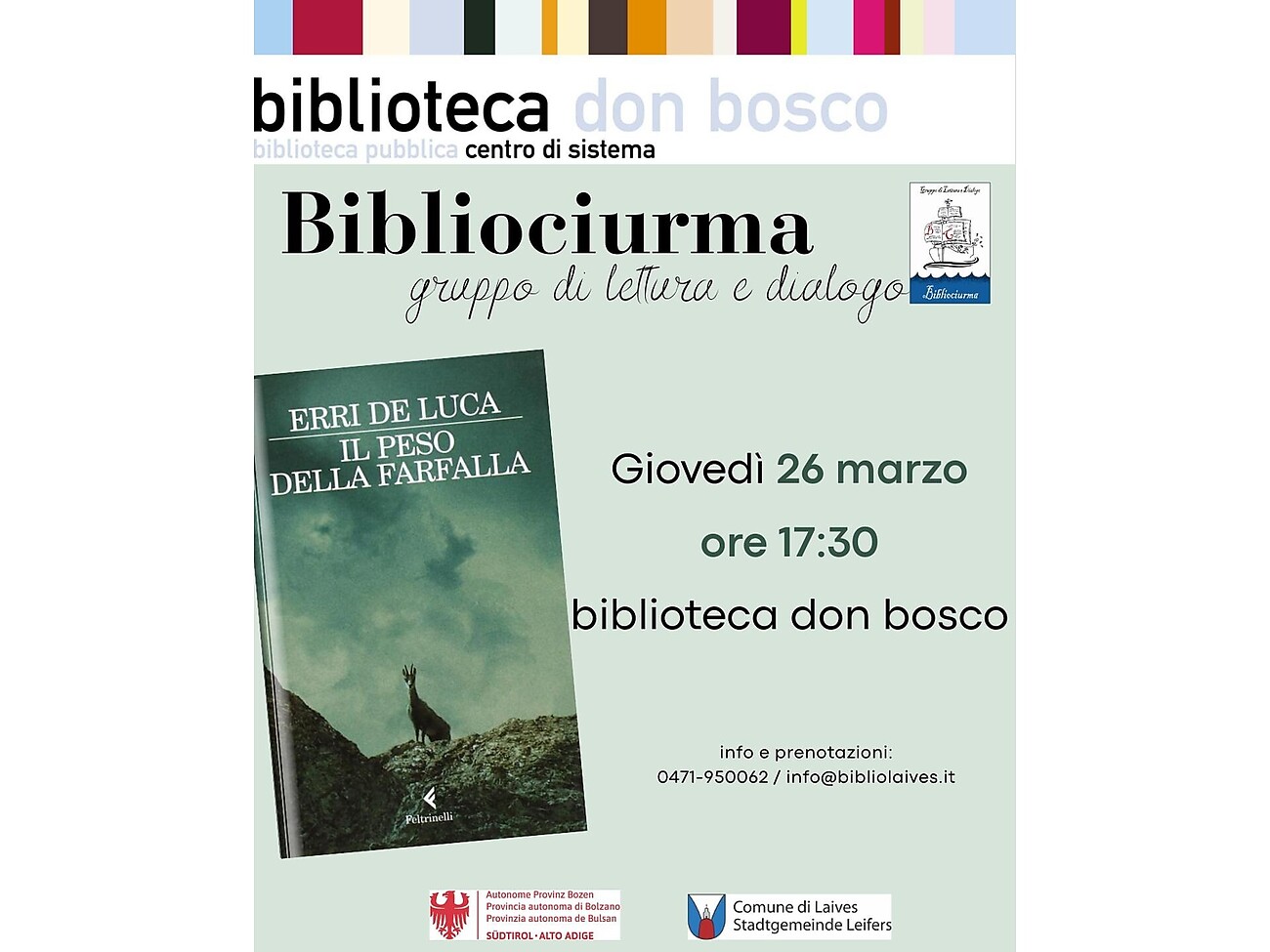 Info e prenotazioni: 0471/950062; info@bibliolaives.it