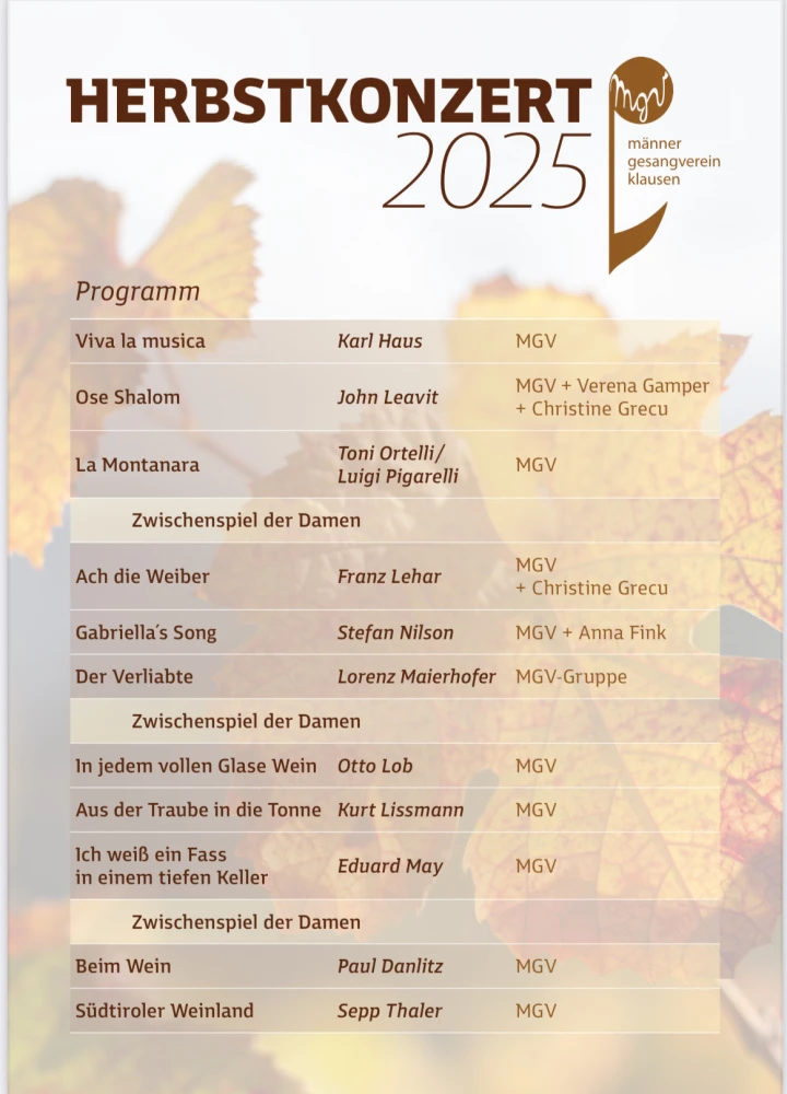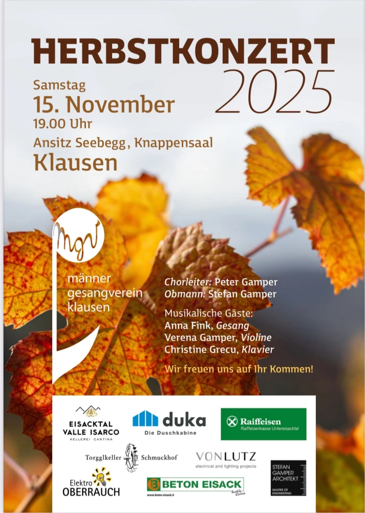 Der Männergesangverein Klausen lädt alle zum traditionellen Herbstkonzert am Samstag, 15. November 2025. Das Konzert findet um 19.00 Uhr im Knappensaal der Musikschule Klausen statt.