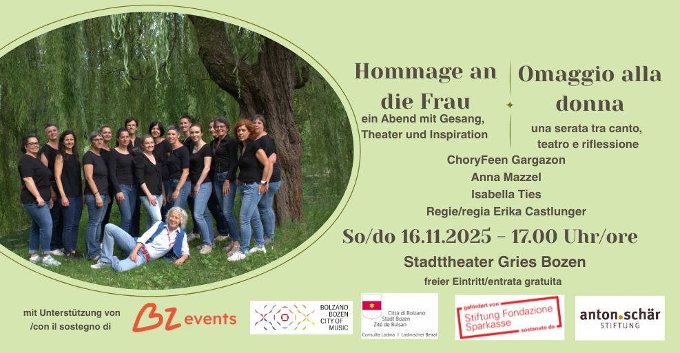 Am 16. November 2025 um 17 Uhr lädt der Frauenchor ChoryFeen Gargazon ins Stadttheater Gries/Bozen zu einem besonderen Chorprojekt ein. Unter der künstlerischen Leitung der ladinischen Theaterpädagogin Erika Castlunger gestalten die Sängerinnen gemeinsam mit den Lektorinnen Anna Mazzel und Isabella Ties einen vielsprachigen Abend – auf Ladinisch, Deutsch und Italienisch.