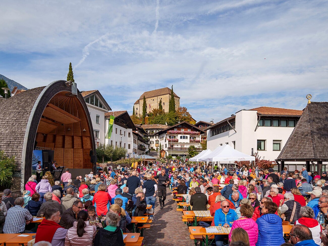 Diverse bancarelle offrono specialità altoatesine da gustare e acquistare. Naturalmente non possono mancare le caldarroste e il vino nuovo, il cosiddetto Sußer.