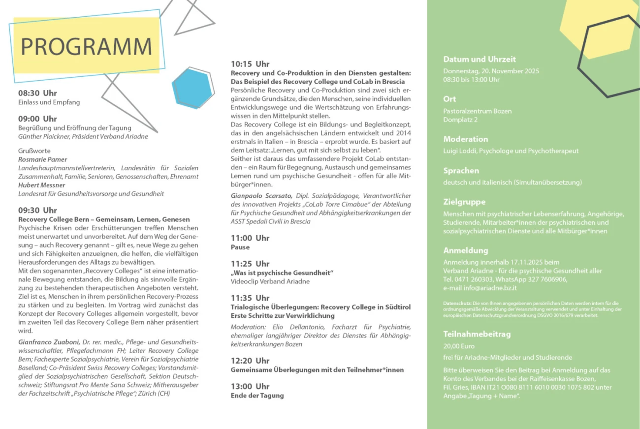 Successivamente si terrà un dialogo con persone interessate, familiari e professionisti: insieme discuteremo la questione centrale se e come un Recovery College potrebbe diventare realtà anche in Alto Adige e di cosa è necessario per realizzarlo.