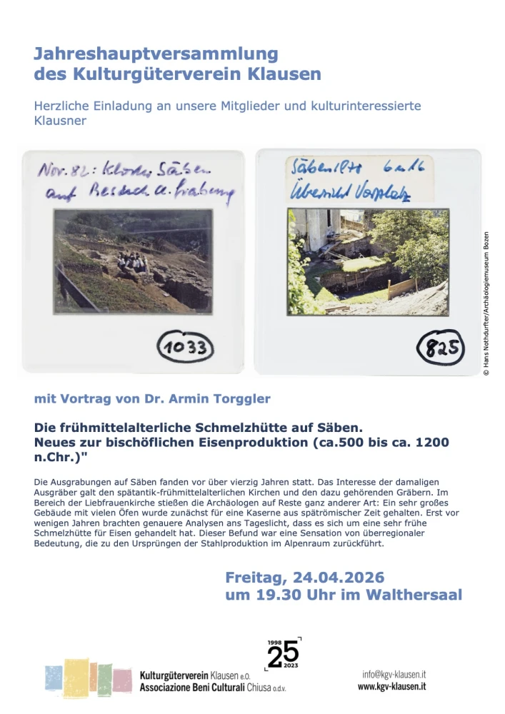 JHV vom KGV und Vortrag: Die frühmittelalterliche Schmelzhütte auf Säben. Neues zur bischöflichen Eisenproduktion (ca.500 bis ca. 1200 n.Chr.)
