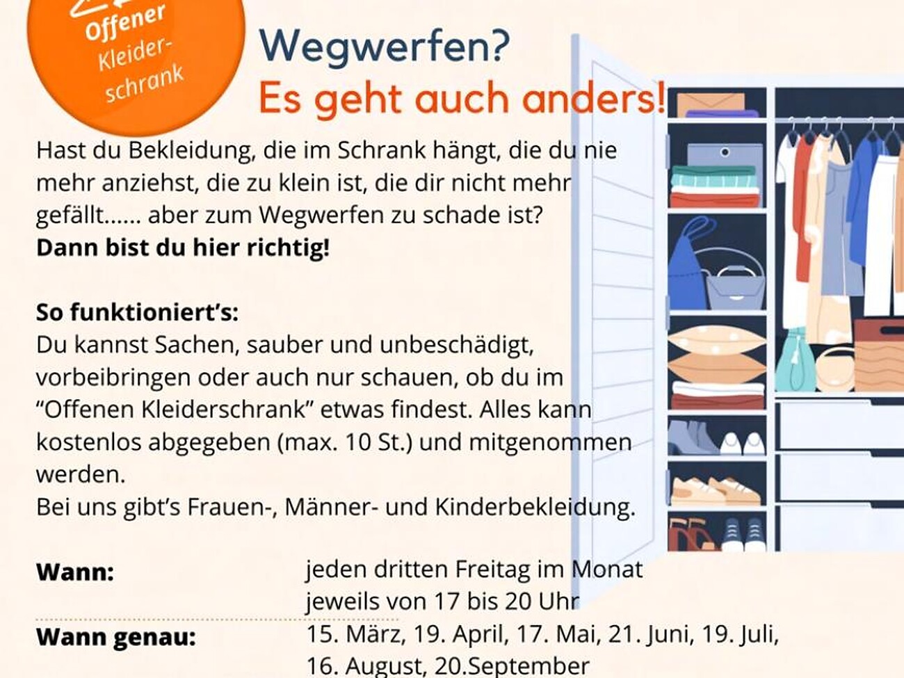 Potete portare i capi puliti e non danneggiati o semplicemente vedere se trovate qualcosa nel "guardaroba aperto". Tutto può essere consegnato gratuitamente (massimo 10 capi) e portato via.