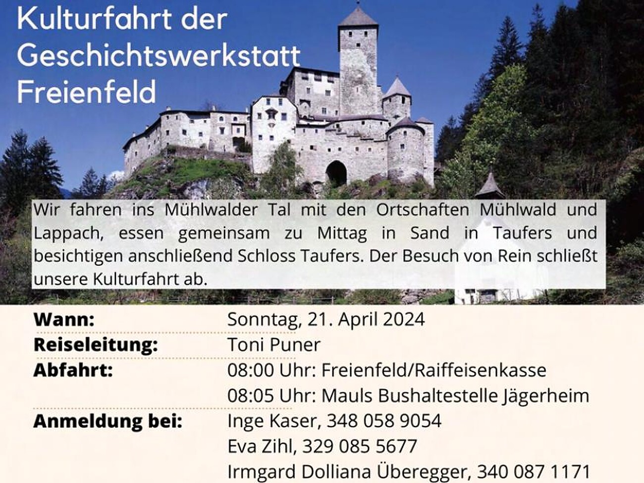 Wir fahren ins Mühlwalder Tal mit den Ortschaften Mühlwald und Lappach, essen gemeinsam zu Mittag in Sand in Taufers und besichtigen anschließend Schloss Taufers. Der Besuch von Rein schließt unsere Kulturfahrt ab.