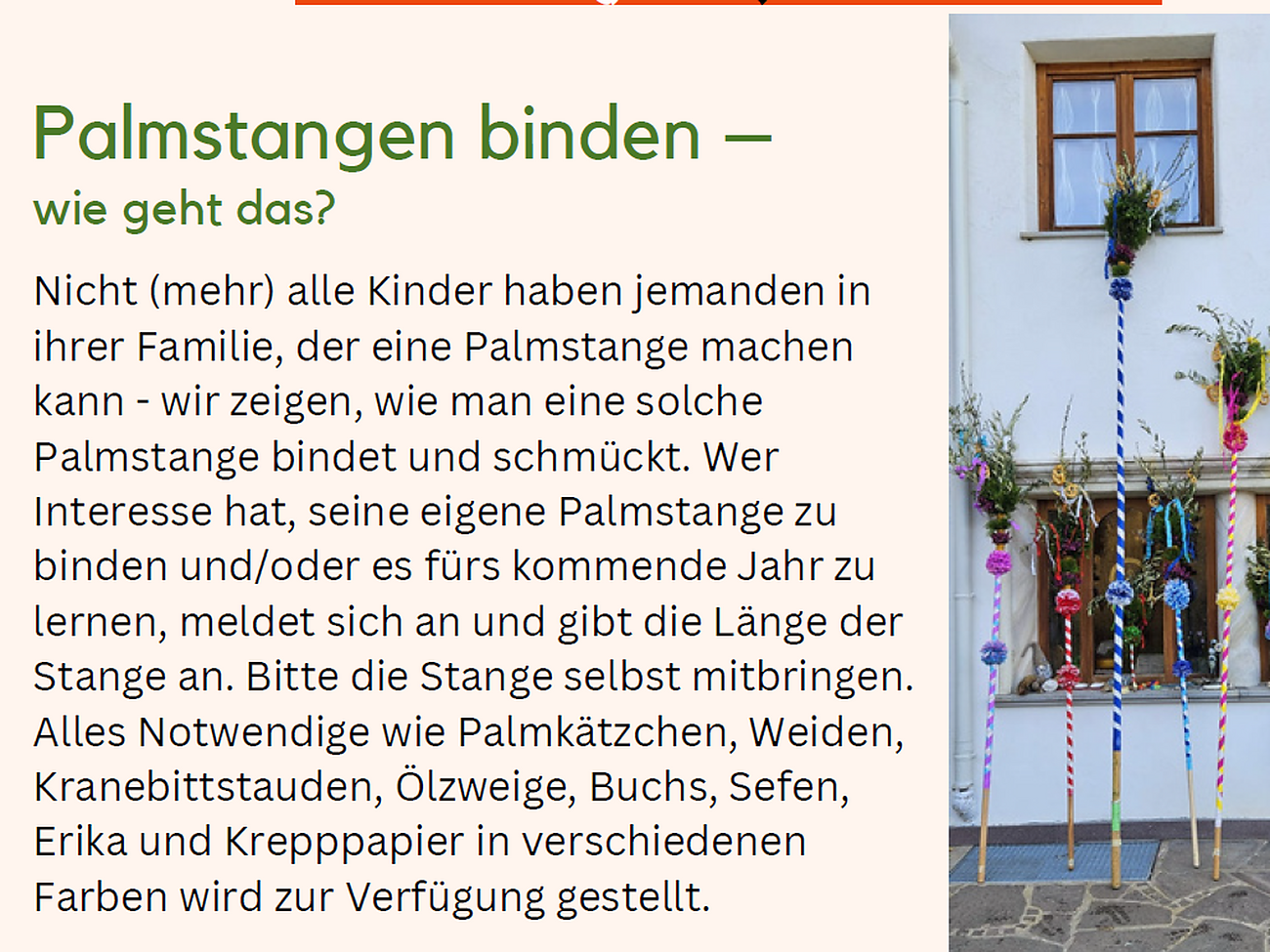 lernen, meldet sich an und gibt die Länge der Stange an. Bitte die Stange selbst mitbringen. Alles Notwendige wie Palmkätzchen, Weiden,