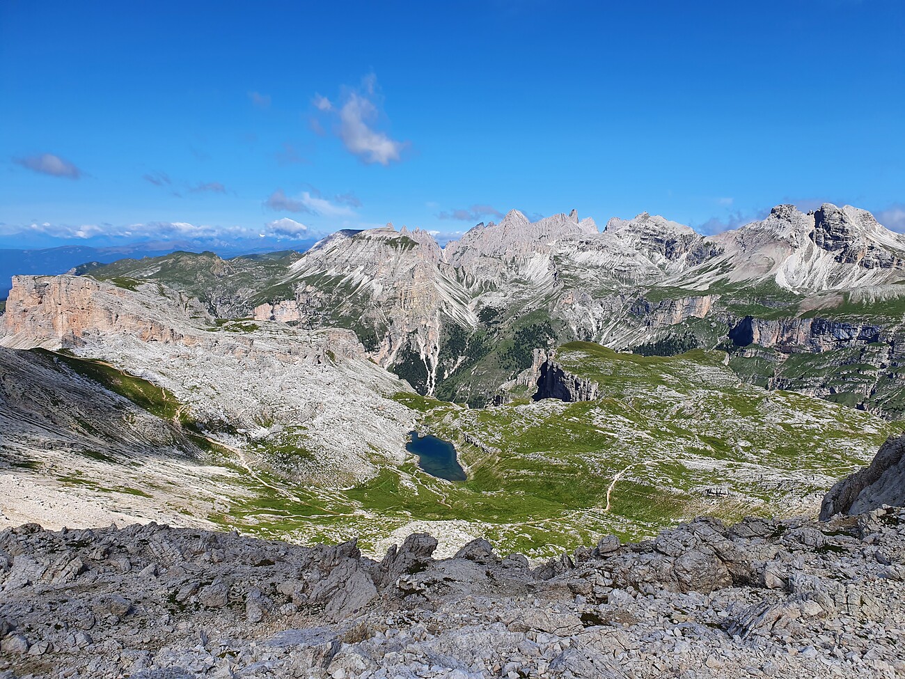 Itinerario: Passo Gardena (2121 m) – Forcela Cier – Forcela Crespëina (2528 m) – Lago Lech de Crespëina – Forcela Ciampëi – Rifugio Puez – Val Stella Alpina – Colfosco (1645 m)
