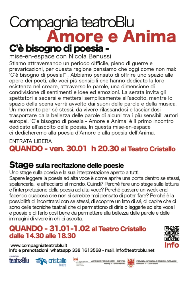 Informazioni e prenotazioni: info@teatroblu.net o whatsapp 3381613568