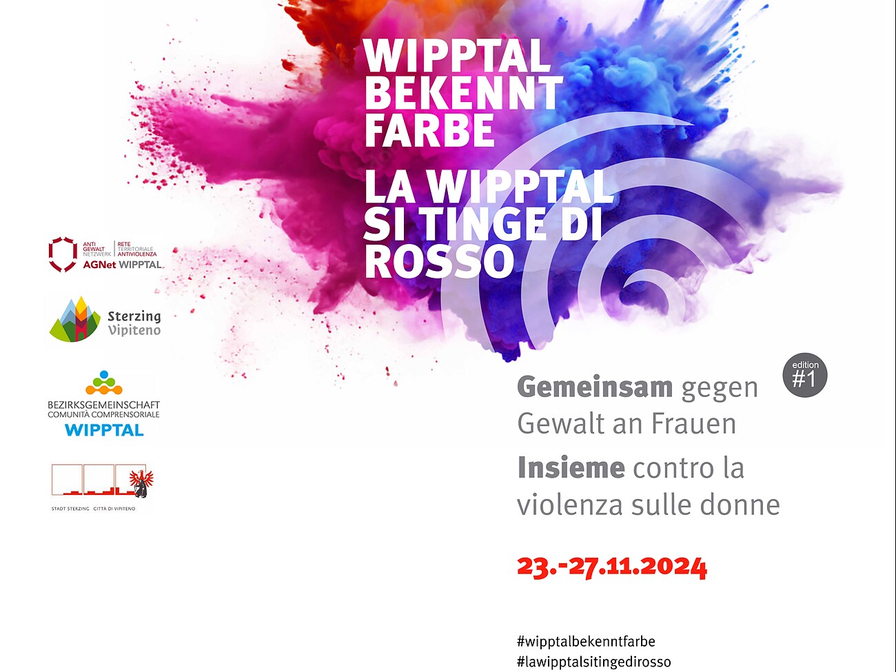 Dal 23 al 27 novembre 2024, a Vipiteno e nella Wipptal, si svolgeranno numerosi eventi e iniziative per schierarsi insieme contro la violenza sulle donne. Oltre a un programma fisso di eventi, altre iniziative sosterranno il messaggio contro la violenza sulle donne: la Torre delle Dodici sarà simbolicamente illuminata di rosso durante il periodo dell’iniziativa, sedie rosse nel centro storico della città attireranno l'attenzione sul tema, le aziende esporranno materiale informativo e un filmato di Liam Fiechter e Marlene Holzknecht sosterrà il lavoro di prevenzione. Inoltre, la mostra “Com’eri vestita?” sarà esposta in tutti i comuni della Wipptal.