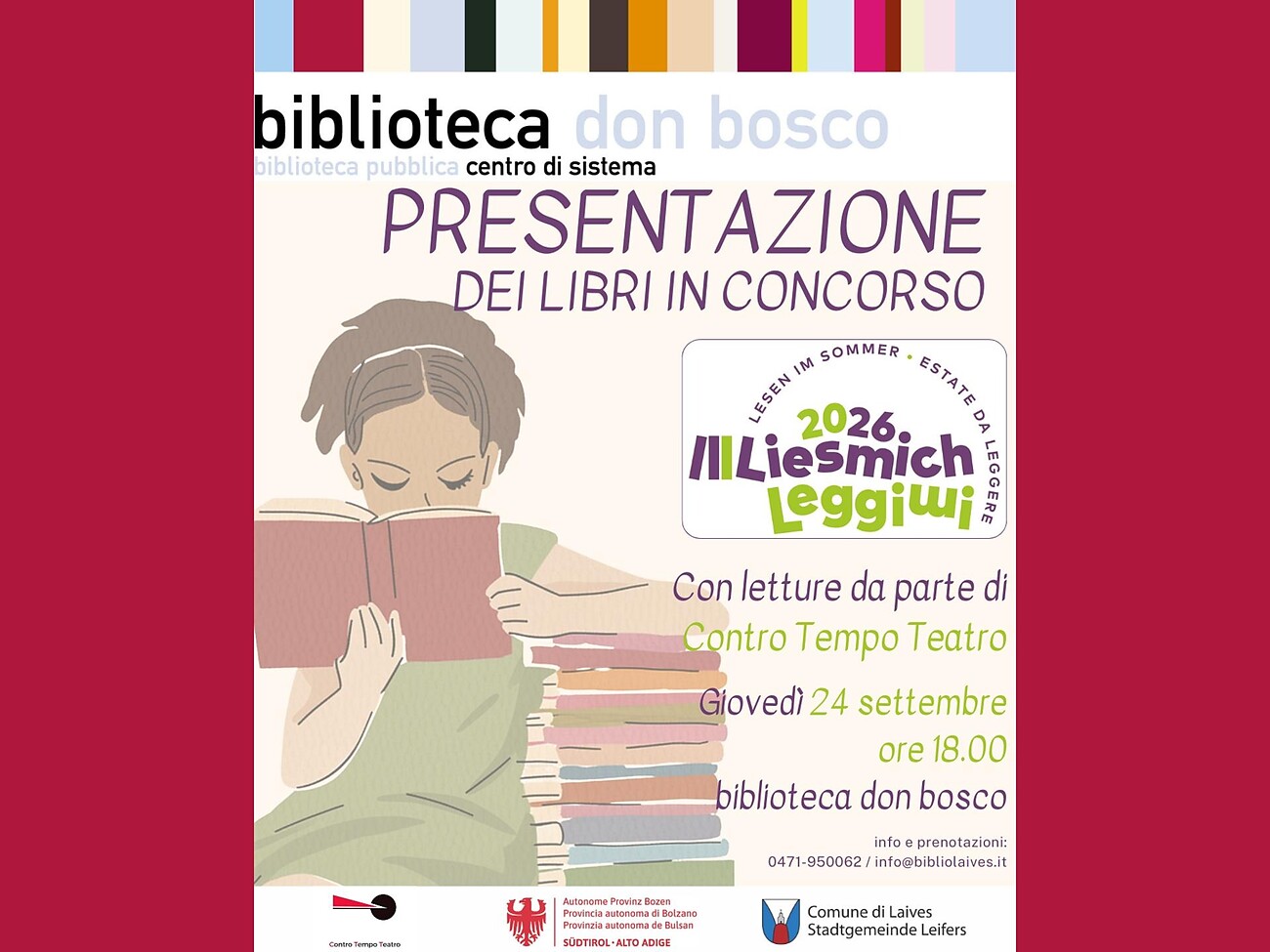 In collaborazione con Contro Tempo Teatro, il giorno 24 settembre, alle ore 18:00 presso la biblioteca don bosco, si terrà la presentazione dei libri in concorso al progetto Leggimi - Liesmich. Dopo la presentazione dei libri, ci saranno anche alcune letture appositamente scelte.