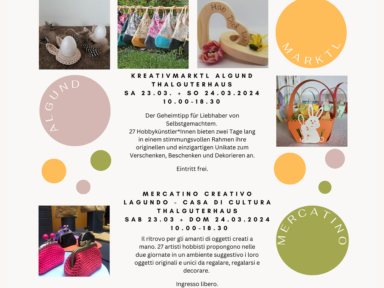 Vi aspettiamo alla terza edizione pasquale del Mercatino Creativo Lagundo! Nelle due giornate i 27 creativi vi mostrano le loro opere fatte a mano, come uova di Pasqua dipinte a mano e decorazioni pasquali, gioielli, orologi da parete, candele, borse e portafogli, arte del vetro Tiffany, biglietti d'auguri, oggetti in ceramica e porcellana, tessili, abbigliamento per bambini, articoli all'uncinetto, oggetti decorativi in legno, carta, feltro e cemento, articoli speciali per gli amanti del vino, per i compleanni dei bambini, per la prima comunione, composizioni floreali e molti altri oggetti originali e unici da regalare, regalarsi e decorare! Venite a trovarci!