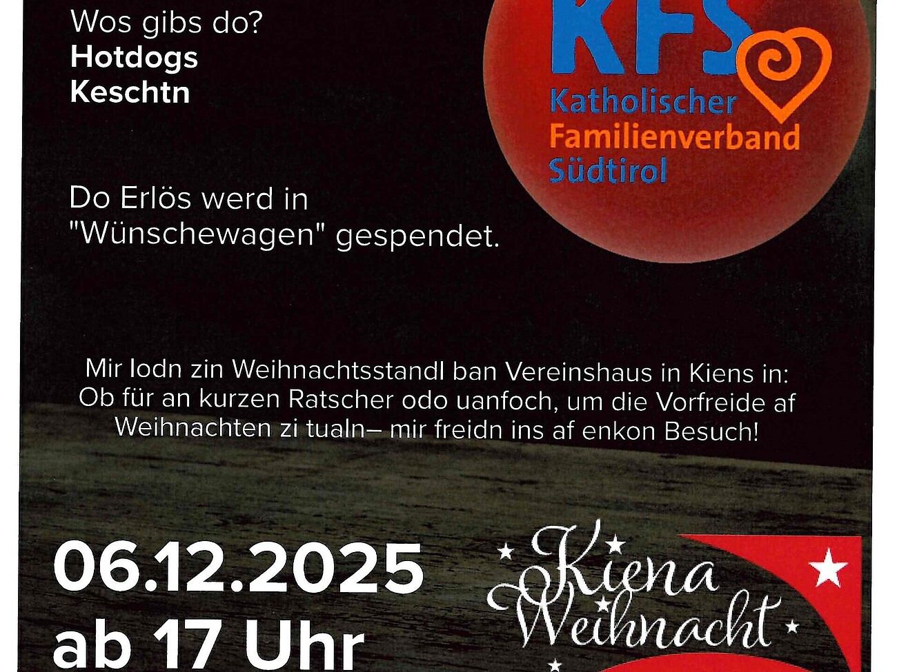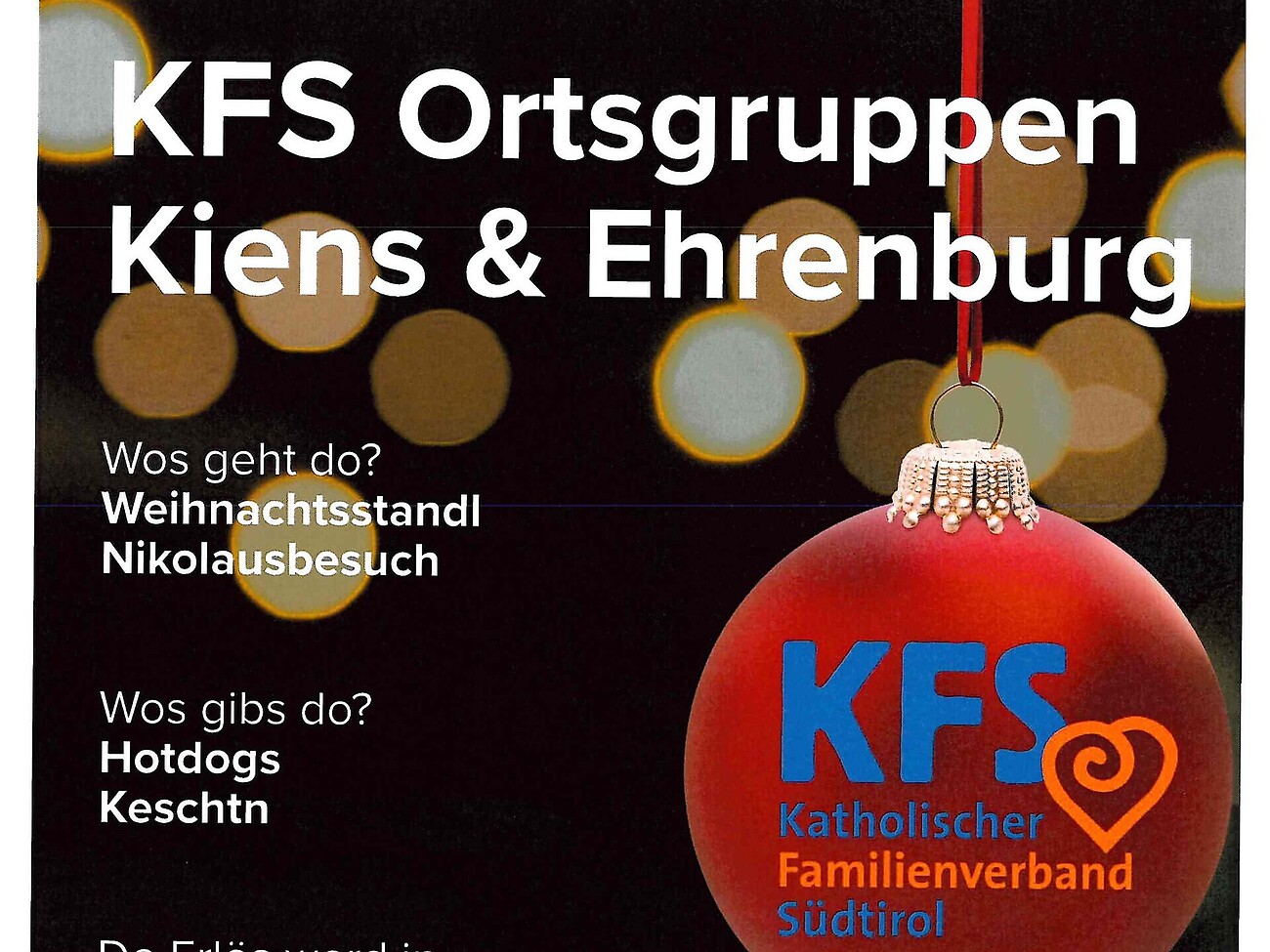 I gruppi locali KFS dei comuni di Chienes ed Ehrenburg vi invitano cordialmente al Mercatino di Natale di Chienes!