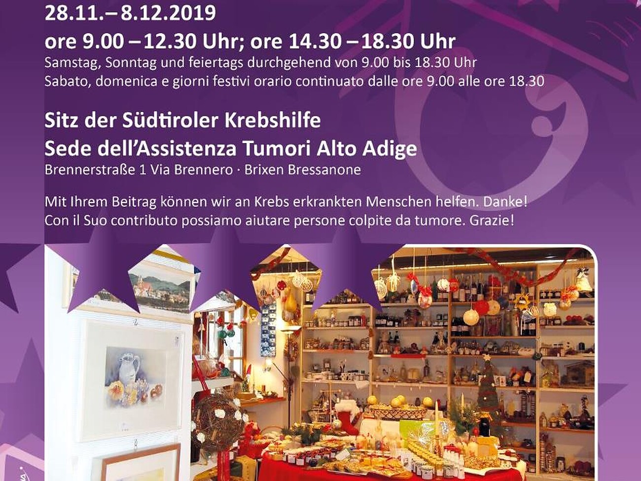 Orario d'apertura: ore 9-12.30 e 14.30 - 18.30, sabato, domenica e giorni festivi dalle ore 9 alle ore 18.30