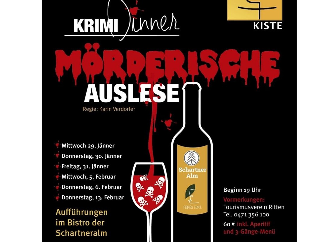 messa in scena dalla Theaterkiste Lengmoos al Bistro della SchartnerAlm alle ore 19. Cena con lo chef Jakob Eckl, regia di Karin Verdorfer.