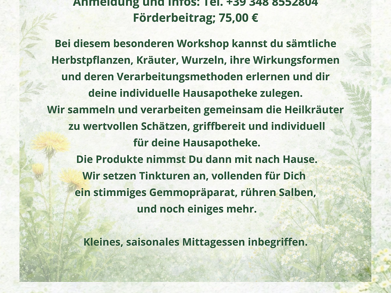 Durante questo workshop speciale potrai conoscere tutte le piante autunnali, le erbe e le radici, le loro proprietà, le forme di utilizzo e i metodi di trasformazione, creando la tua farmacia naturale personalizzata.