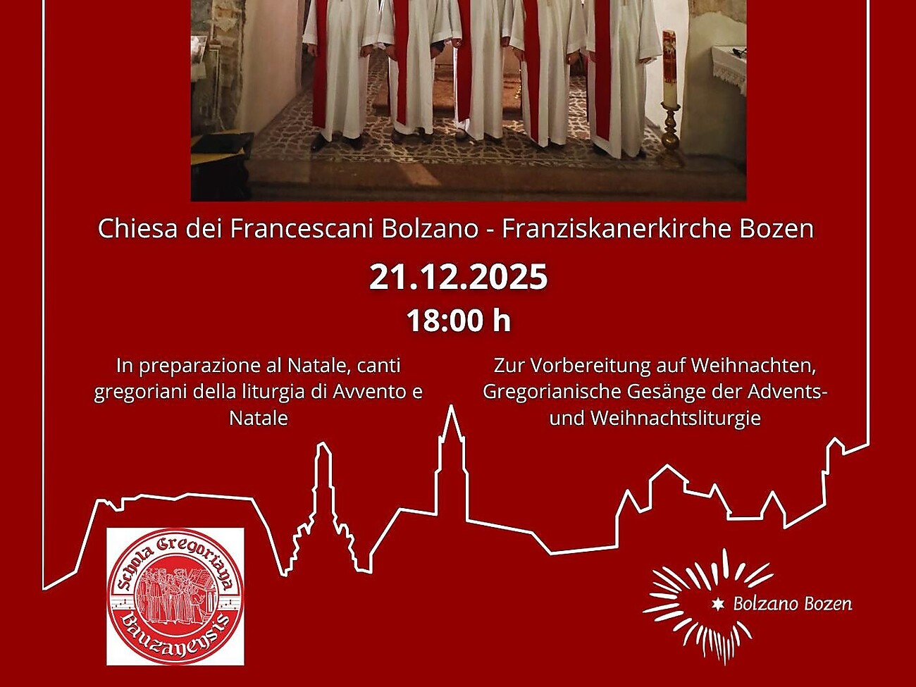 In preparazione al Natale, la Schola Gregoriana Bauzanesis, sotto la direzione di Maria Carmen Pectu, presenta un raffinato concerto di canto gregoriano nella suggestiva cornice della Chiesa dei Francescani a Bolzano.