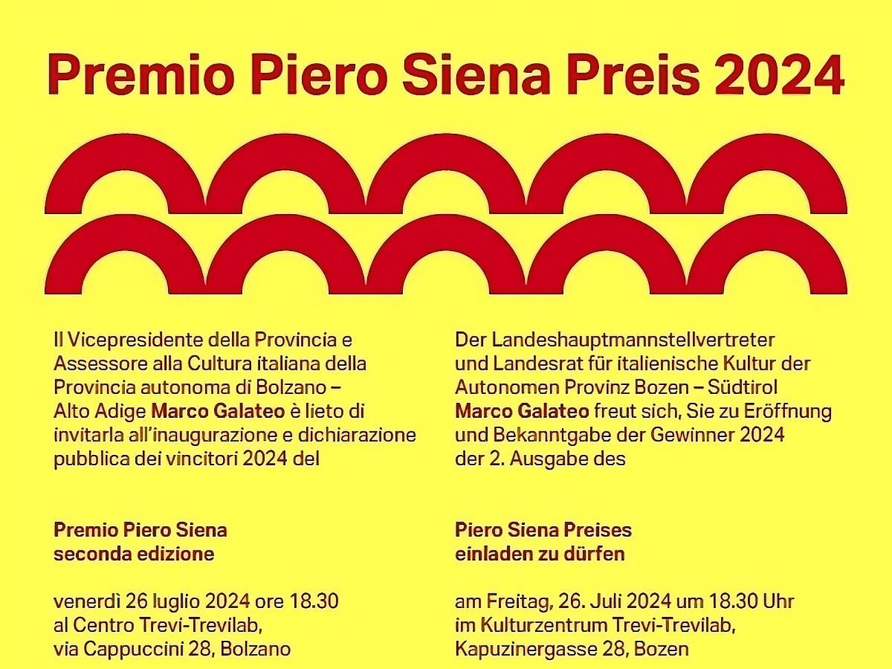 Il Vicepresidente della Provincia e Assessore alla Cultura italiana della Provincia autonoma di Bolzano - Alto Adige Marco Galateo è lieto di invitare all inaugurazione e dichiarazione pubblica dei vincitori 2024 del Premio Piero Siena. Interverranno accanto alle artiste e agli artisti Antonio Lampis(Direttore del Dipartimento Cultura italiana e Sviluppo Economia), Eva Fabbris(Direttrice del Museo Madre, Napoli), Bart van der Heide(Direttore di Museon, Bolzano), Paolo Tognon(Storico dell arte e curatrice del premio), Frida Carazzato e Valentina Caramerotti(prima giuria del premio)