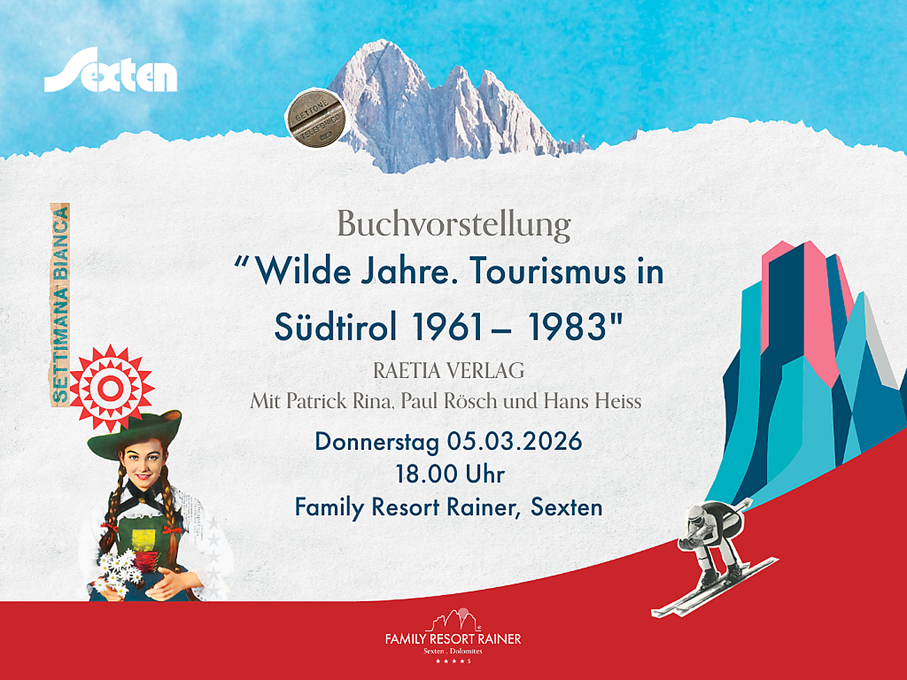 Giovedì 5 marzo 2025, presso il Family Resort Rainer, si terrà la presentazione del libro “Wilde Jahre. Tourismus in Südtirol 1961-1983” (Anni turbolenti. Il turismo in Alto Adige dal 1961 al 1983), che avrà inizio alle ore 18:00 in lingua tedesca.