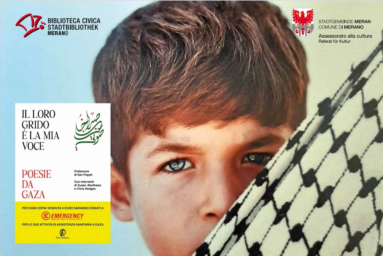 Organizzatore: Biblioteca Civica di MeranoDa un’idea di Giuseppe Pino Maiolo, psicoanalista, giornalista e docente universitario, il recital ha l’intento di unire la poesia di poeti di Gaza, la musica palestinese e le immagini del giovane fotografo Shadi AlWawy, dove la parola si fa immagine.