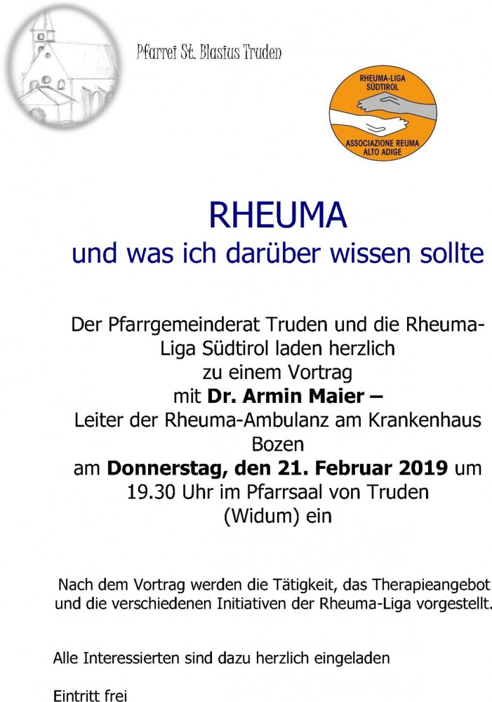 Der Pfarrgemeinderat Truden u. die Rheuma-Liga Südtirol laden herzlich zu einem Vortrag mit dem erfahrenen Rheumatologen Dr. Armin Maier am Do, 21. Februar um 19:30 Uhr im Pfarrsaal von Truden (Widum) ein. Nach dem Vortrag werden die Tätigkeit, das Therapieangebot und die verschiedenen Initiativen der Rheuma-Liga vorgestellt. Alle interessierten sind herzlich eingeladen. Der Eintritt ist frei.