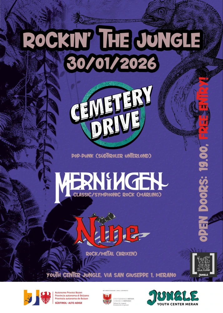 Organizzatore: Youth Center JungleIl 30 gennaio 2026 inizia la nuova stagione concertistica al Centro Giovani Jungle di Merano! Tre band rock ed energiche presenteranno la loro musica sul palco del Jungle. L’ingresso è gratuito! Inizio: ore 19.00