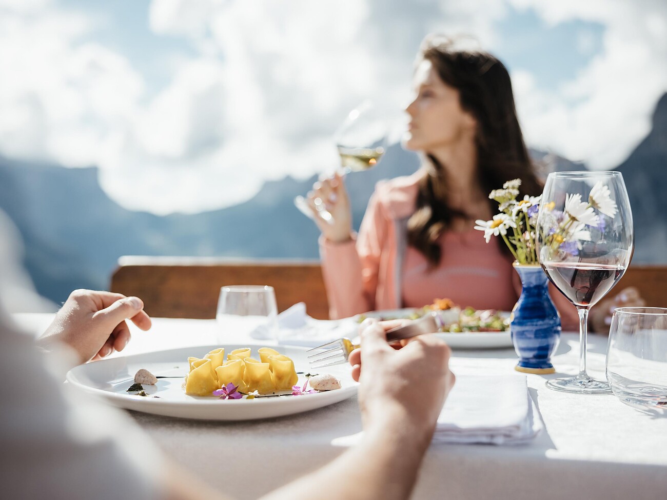 Immagina di ammirarlo dai prati del Gherdenacia, mentre gusti una cena a più portate preparata dai ristoratori di La Villa. Tra un piatto e l’altro, con un buon bicchiere di vino e musica dal vivo, potrai lasciarti incantare dallo spettacolo delle montagne Sas dla Crusc, Lavarela e Conturines che si tingono di meraviglia.
