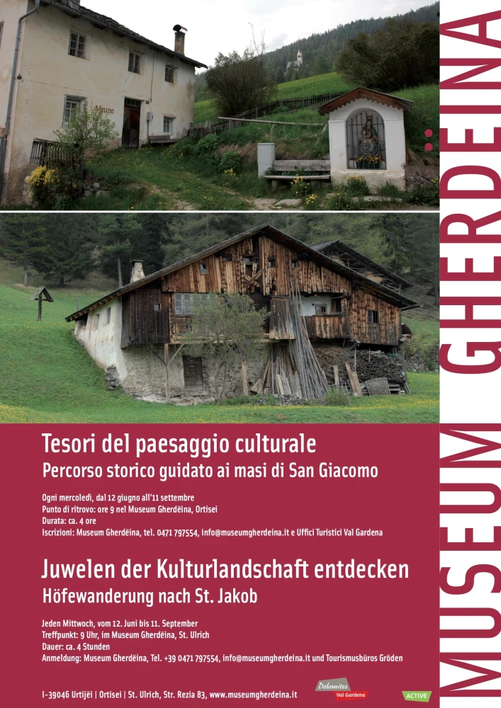 Organizzatore: Museo Val Gardena - Museum GherdëinaPercorso storico guidato tra gli originali masi di San Giacomo fino alla più antica chiesa della valle, con un’ introduzione all’architettura rurale e la storia dell’insediamento press oil Museum Gherdëina nel centro di Ortisei. Durante la passeggiata attraverso prati e boschi sarà possibile visitare all’interno la chiesetta con la sua preziosa decorazione ad affresco e i caratteristici masi di Peza, entrato a far parte dei Luoghi del cuore FAI 2020, e Mëune conservati ancora nel loro stato originale. All’interno sono esposti alcuni modellini artigianali che riproducono momenti della vita al maso di un tempo.