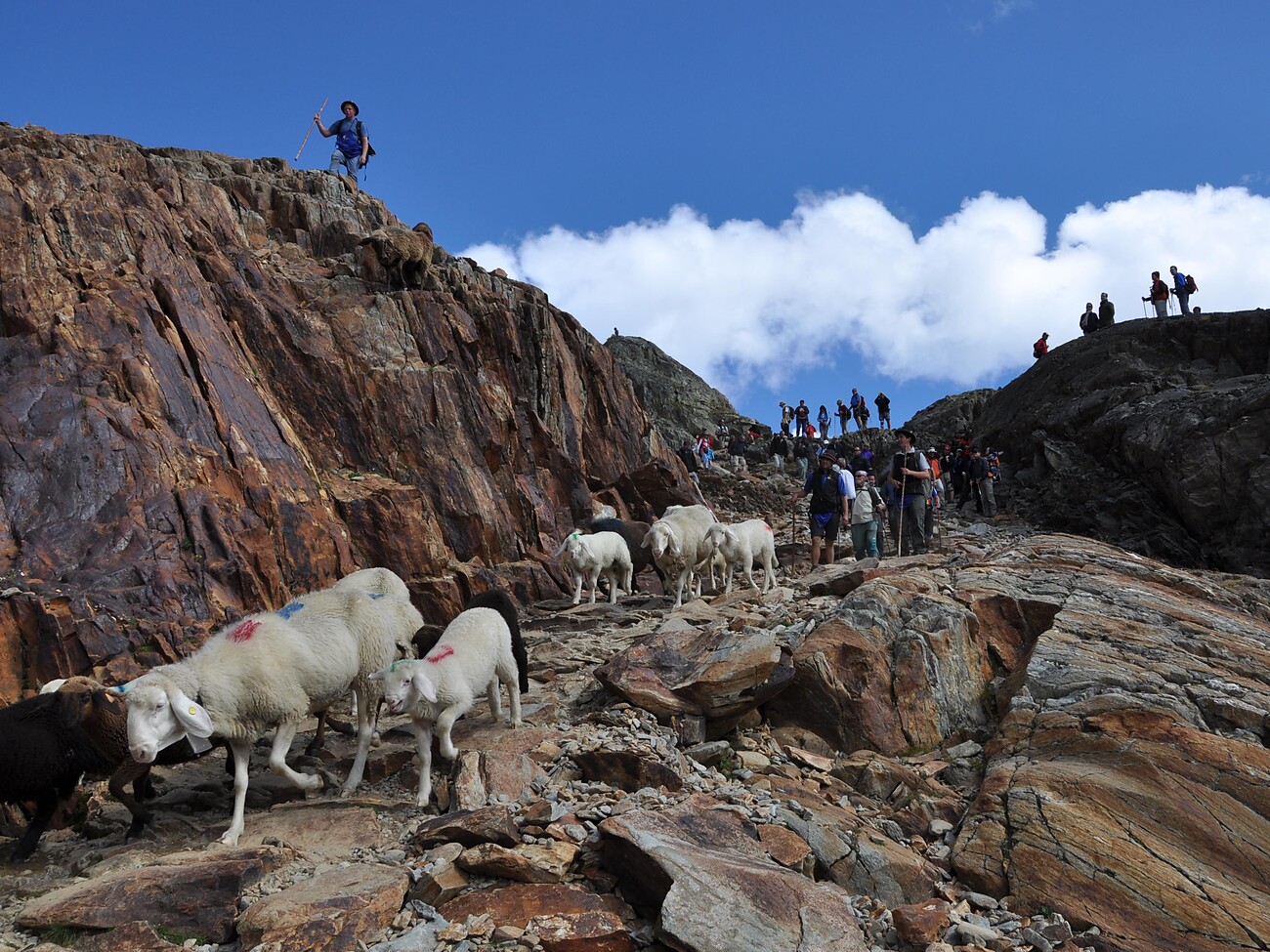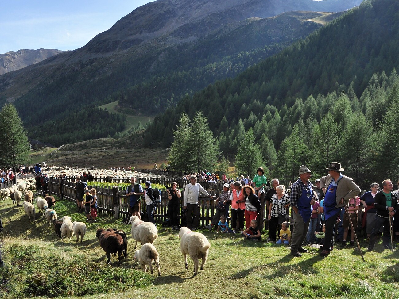 Rientro di oltre 1.500 pecore dalla malga „Rofenberg“ (A) con partenza di buon mattino. Attraversamento dei greggi al Giogo Alto nei pressi del rifugio Bella Vista (2845m) verso le ore 11.30 circa. Arrivo delle pecore a Maso Corto tra le ore 15.00 e le ore 16.00.