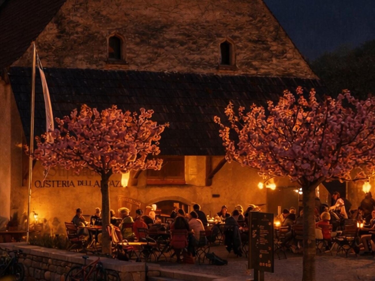 Tra alberi in fiore, angoli accoglienti e musica rilassante, potrete prolungare il piacere del dopolavoro e godervi la primavera nel suggestivo ambiente dell’Osteria Abbaziale.