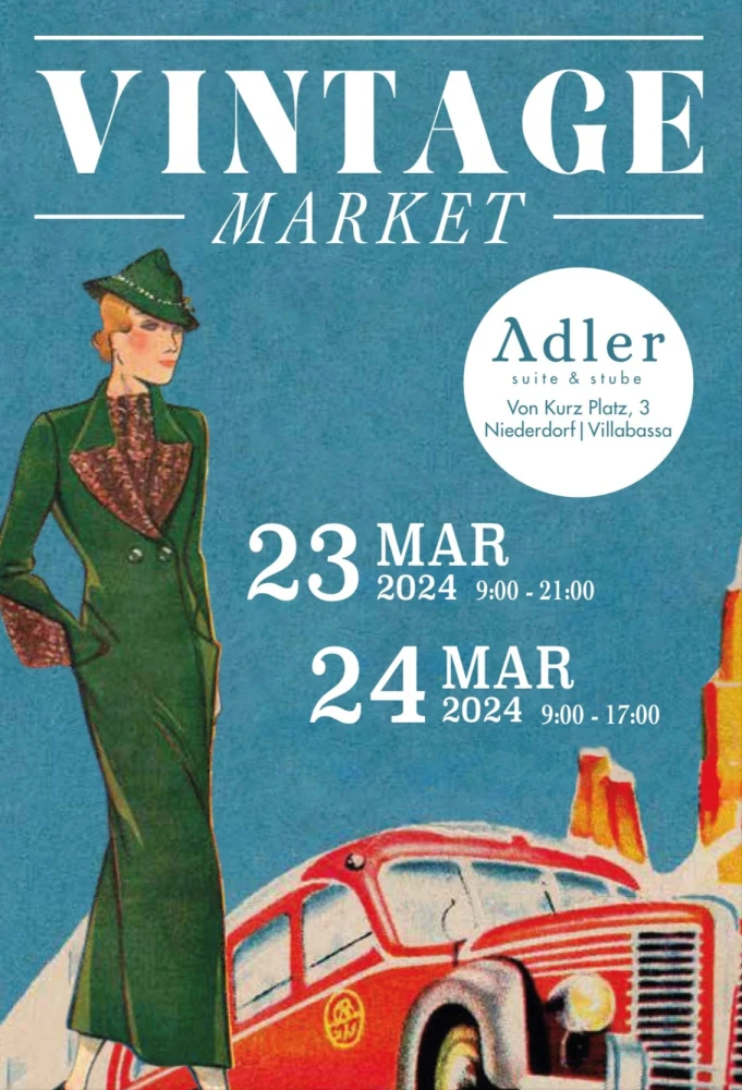 Organizzatore: Adler Suite & StubeSabato dalle 9:00 alle 21:00 e domenica dalle 9:00 alle 17:00. Per un intero fine settimana la Locanda Hotel Adler di Villabassa è all´insegna del Vintage. 12 bancarelle selezionate proporranno accessori storici di pregio, dagli occhiali da sole alle scatole per cappelli. Il Ristorante Adler servirà piatti vintage di propria creazione.
