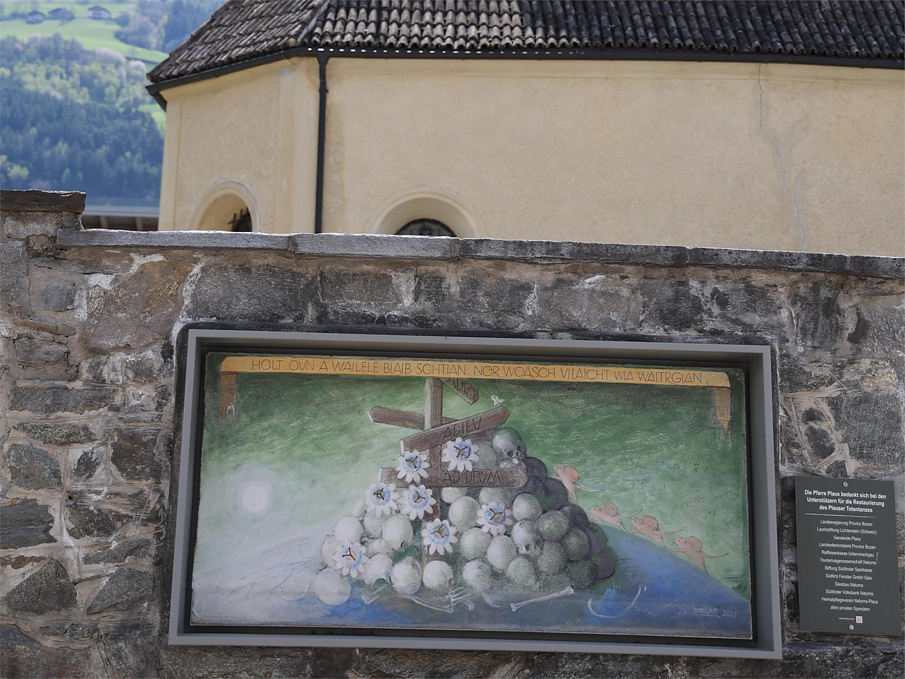„Fermati per qualche momento, poi magari sai come andare avanti.“ Questa è una delle 18 frasi sulle schede illustrative del „Plauser Totentanz“ sul muro del cimitero di Plaus pitturate dall’artista Luis Stefan Stecher.