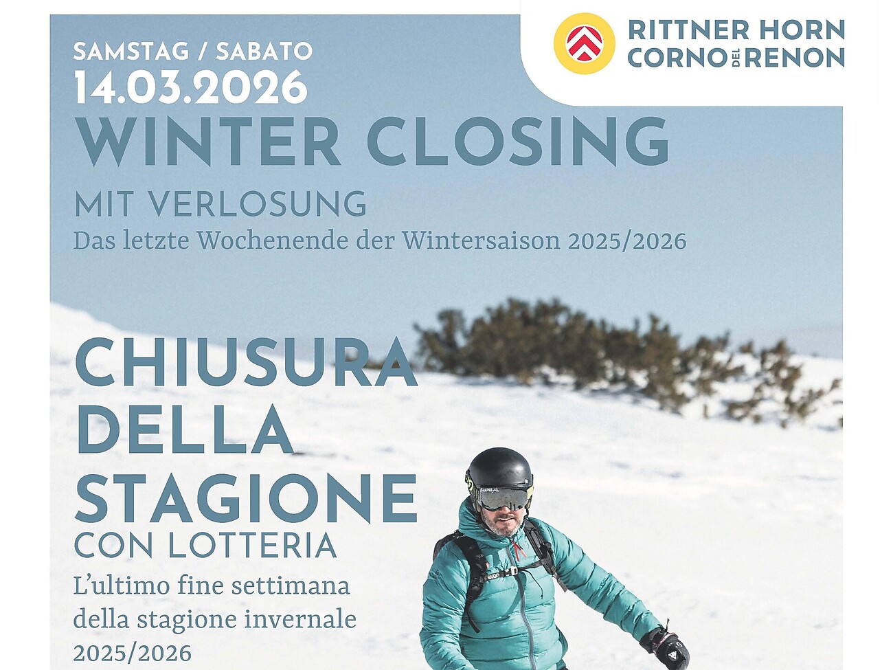 Informazioni lotteria: entro le ore 13.30 ritirare il biglietto di lotteria presso la biglietteria della stazione a valle. Ore 15 grande lotteria con presenza obbligatoria presso la Feltuner Hütte. Possono partecipare tutti coloro che hanno acquistato uno skipass stagionale Corno del Renon/Ortler Skiarena 2025/2026 presso la Funivie Corno del Renon SpA a prezzo regolare.